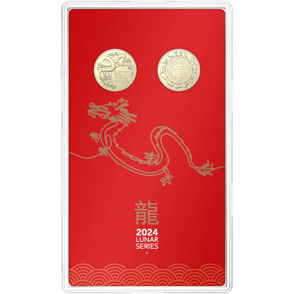 To celebrate the Lunar Year of the Dragon, the Royal Australian Mint has released this 2024 $1 Uncirculated Two-Coin Set featuring the confident and noble Dragon and the Lunar calendar wheel.